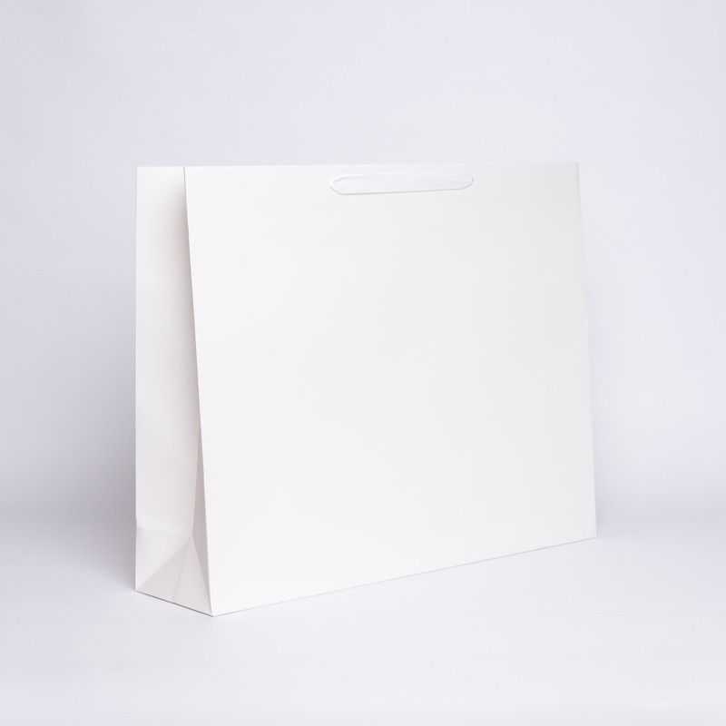 Chic, moderne et original, le sac ajoute de la valeur à vos produits. Il est résistant grâce à son papier couché de 170 gr/m² (pelliculé mat ou pelliculé brillant selon la couleur sélectionnée), son fond renforcé et ses bords supérieurs doublés d'un carton de renfort encollé de 400 gr/m². Il peut transporter vos produits en toute sécurité.