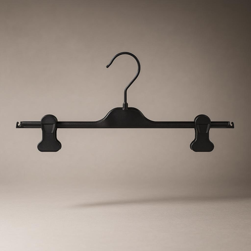 Le cintre à pinces noir avec crochet pivotant 360° (CPIP-28-36-40) est une solution pratique et élégante pour suspendre bas, pantalons, jupes et vêtements délicats dans les magasins de vêtements, boutiques de mode et dressings professionnels. Conçu pour offrir une présentation soignée et professionnelle, ce cintre à pinces pour vêtements combine fonctionnalité, résistance et design minimaliste.