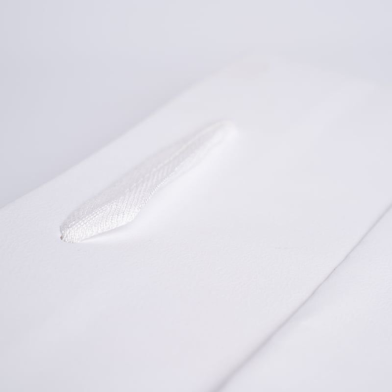 Le moment joaillerie. Format S blanc pour bagues et pendentifs. Avec sticker gaufré et ruban monochrome, le sac kraft texturé inspire précision et confiance.