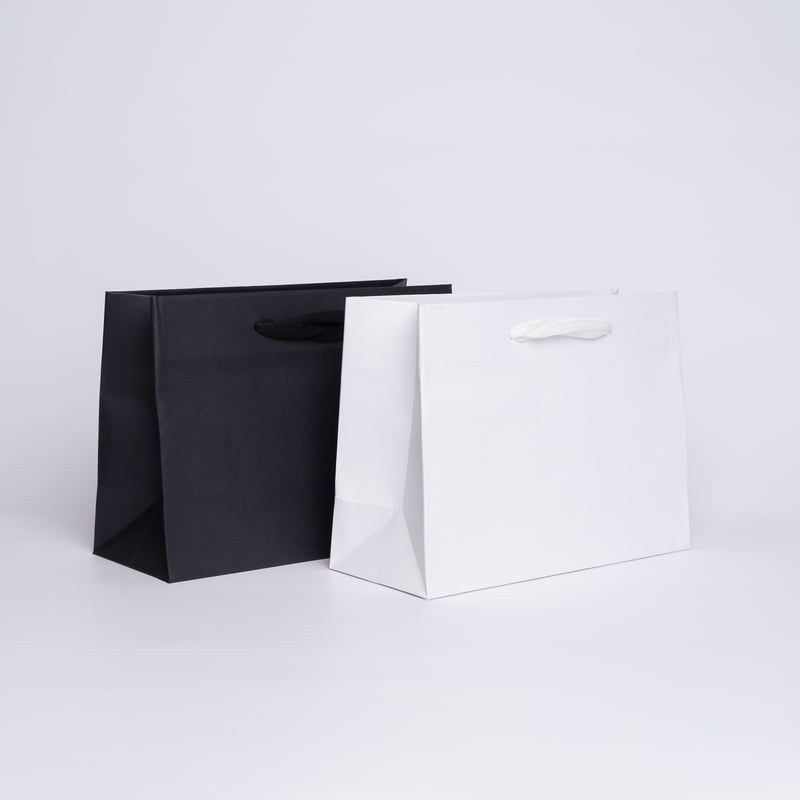 - Palette intemporelle. Deux piliers de marque — sac papier noir et sac papier blanc — pour mode, mariage, corporate et fêtes.